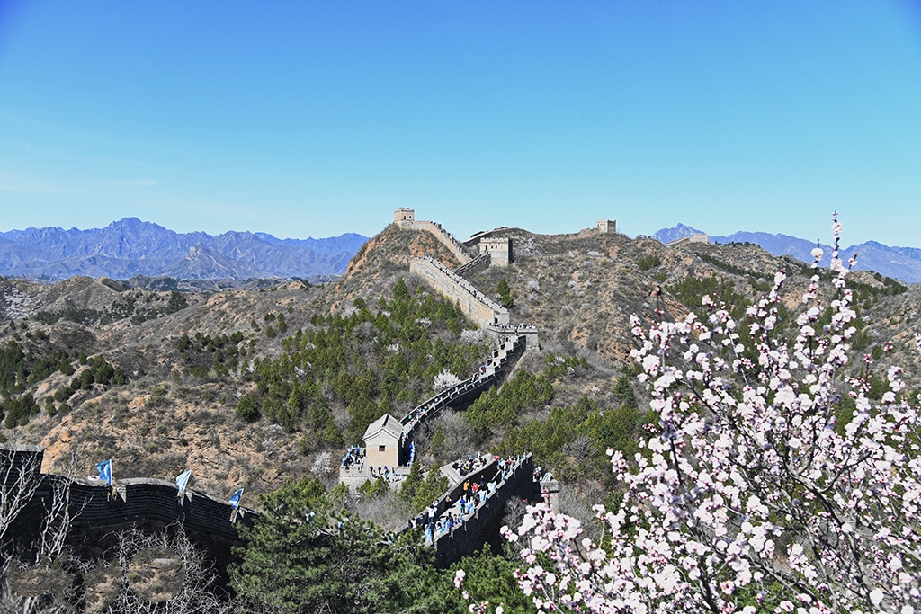 4月5日,河北省滦平县,金山岭长城景区内10万亩野生山杏花盛开,与雄伟的长城交相辉映,形成独特的“边塞春景”。人民网记者周博摄