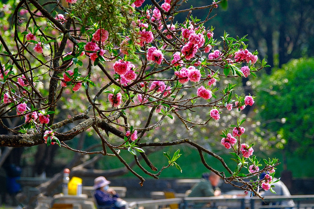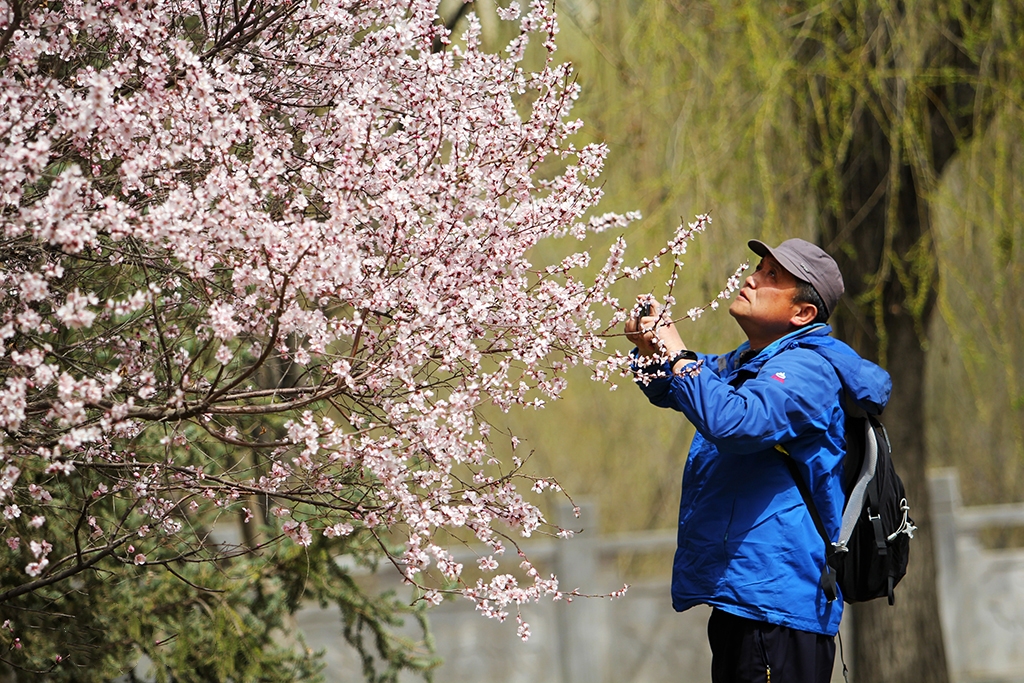 3月31日,甘肃省兰州市七里河区南滨河中路,市民驻足碧桃花下,用手机定格满树芬芳。人民网记者 米媛摄