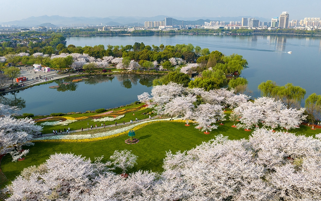 3月26日,浙江省绍兴市柯桥区瓜渚湖畔的樱花和郁金香大面积盛开,美不胜收,吸引游客前来赏花踏青。人民网 章勇涛摄