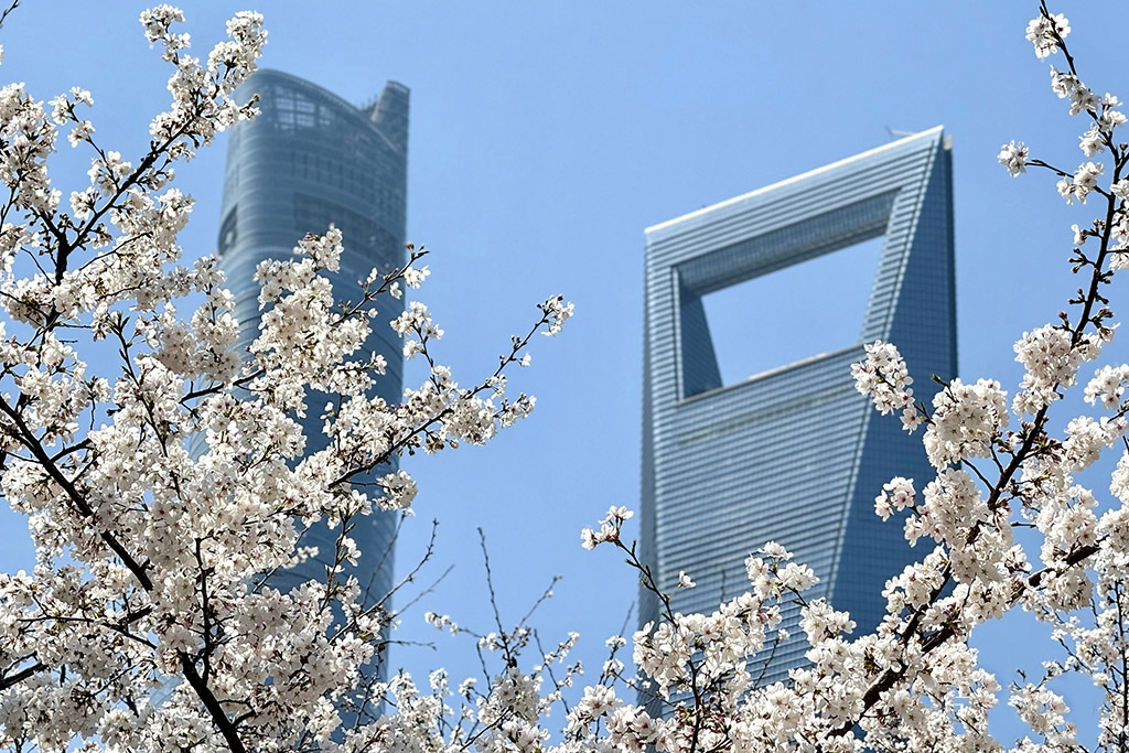 3月25日,上海市陆家嘴世纪大道樱花园内樱花竞相绽放,引得附近上班的白领纷纷前来打卡拍照。人民网记者 龚莎摄