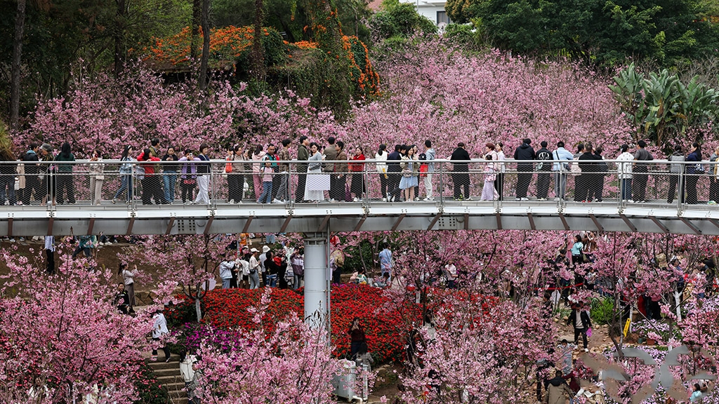 3月24日,在福建省厦门市的狐尾山公园樱花谷,游客们在山海健康步道上赏樱花。人民网记者 陈博摄