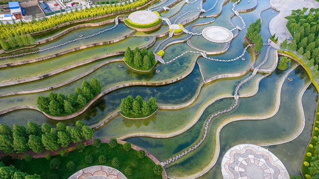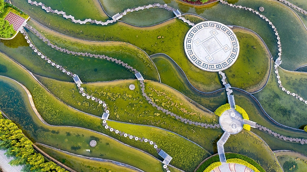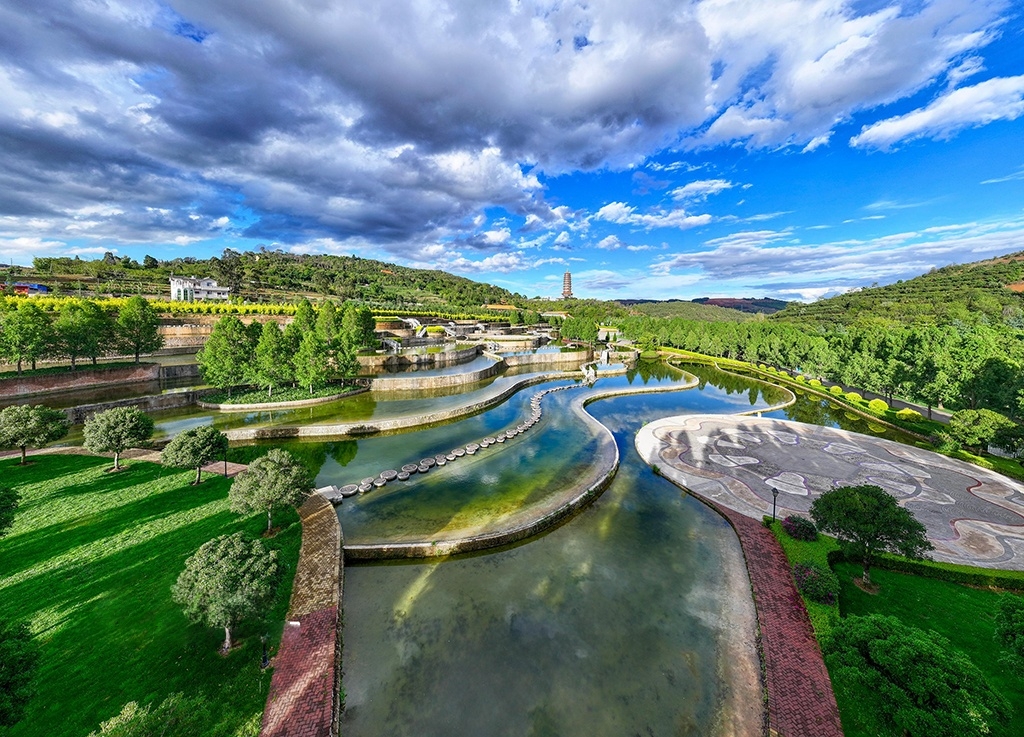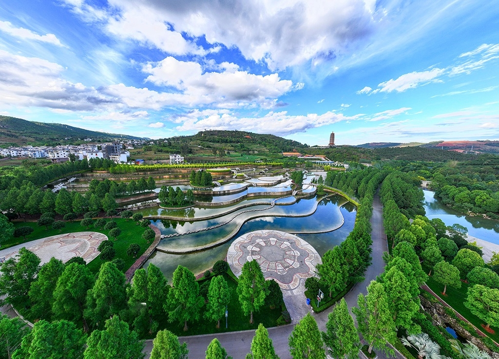 2025年5月30日,云南省红河州弥勒市五彩云池湿地公园,绿树环绕,湖面如镜,与民居、天空、白云相映成趣,构成了一幅美丽的生态画卷,美不胜收。何华文摄(人民图片网)