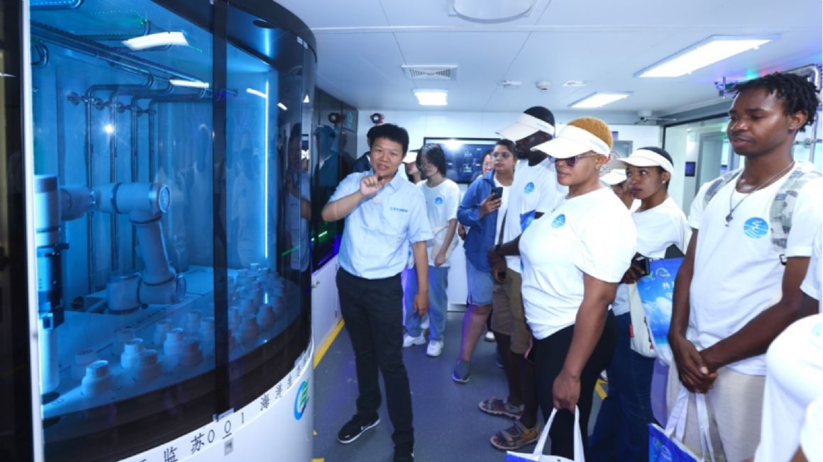 登船参观的留学生代表们对“中国环监苏001”船充满好奇,参观过程中不断与船上工作人员互动,学习了解海洋监测和保护的相关工作,一起发出了“美丽江苏”的赞叹。 在船员指导下,参与者们学习了采样方法,亲手操作设备获取水样,并观察了实时数据分析。留学生们对中国的环保科技表示赞叹,一位来自肯尼亚的留学生感慨道:“亲眼见证中国如何用科技守护母亲河,让我深受启发,希望未来能将这份经验带回自己的国家。”