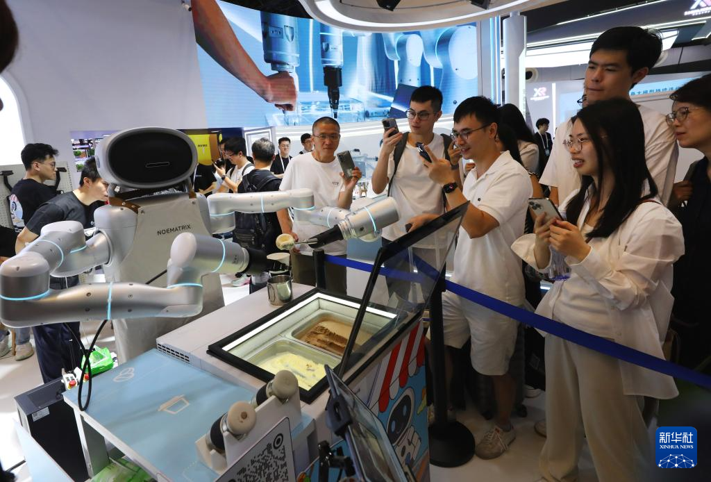 7月29日,一个服务机器人在向参观者演示制作冰激凌球。