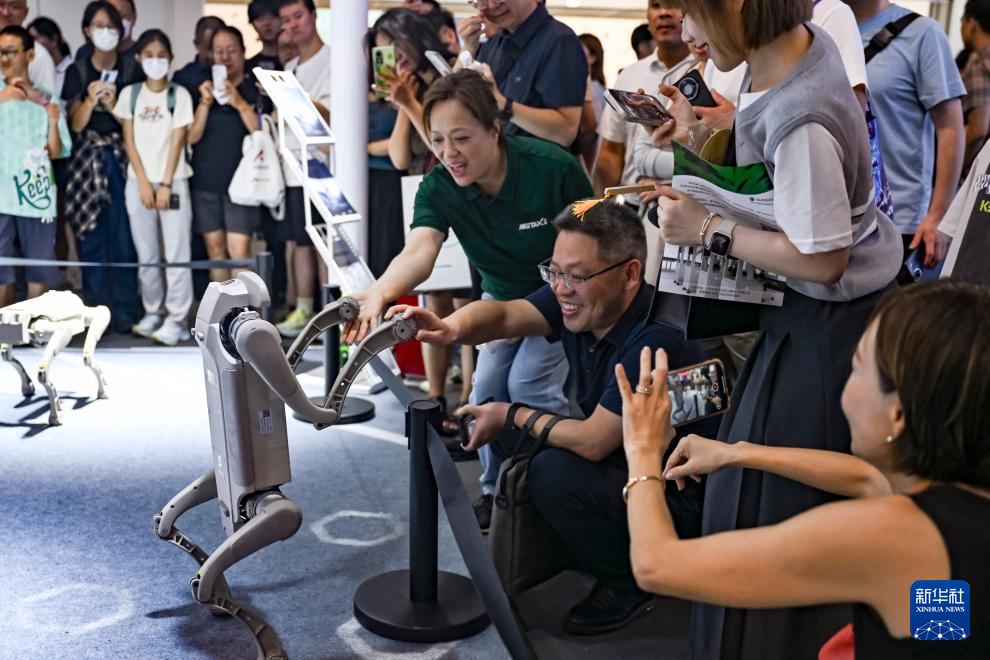 7月29日,参观者在国家电网展区观赏一款用于巡检工作的机器狗。