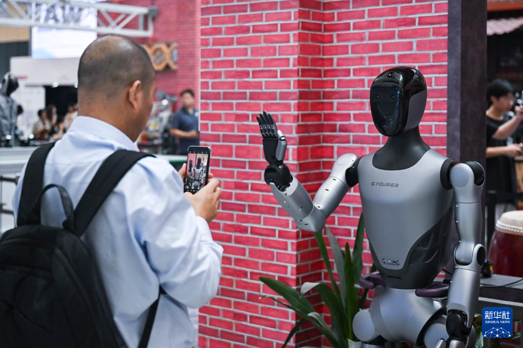 7月29日,观众在傅利叶展区欣赏机器人跳舞。