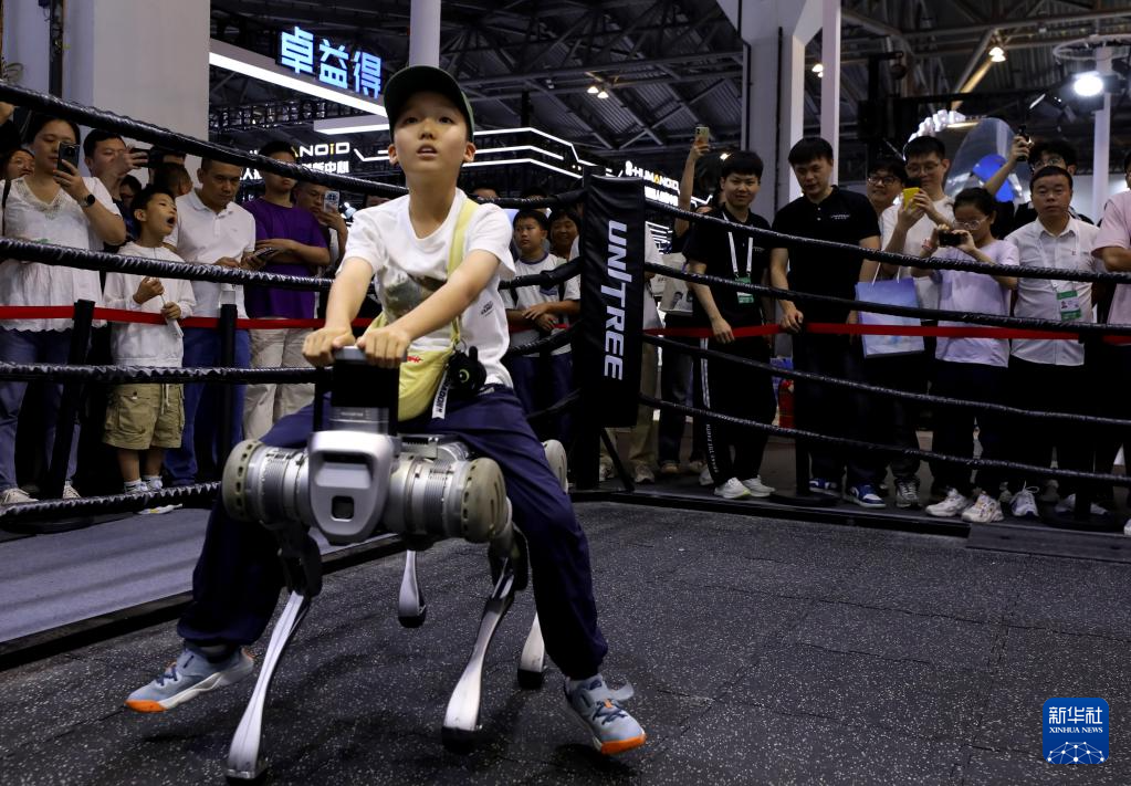 7月29日,小朋友在展会现场体验骑乘四足机器人。