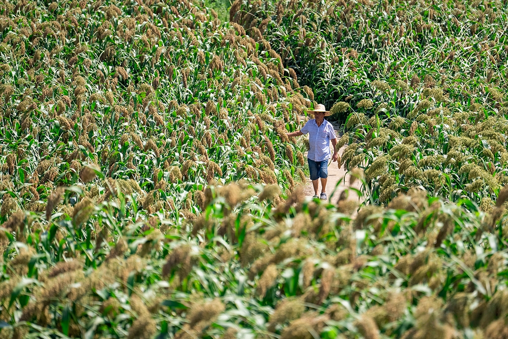2025年7月29日,贵州省仁怀市长岗镇茅坡村的高粱田内,村民正在查看高粱长势。曾经的茅坡村近四成土地受石漠化困扰,严重制约农业生产发展。2019年,仁怀市全面打响土地整治攻坚战,持续推进高标准农田建设。茅坡村同步按照“田成方、渠相通、路相连、旱能灌、涝能排”的标准开展整治,零散地块逐步连片成规模,贫瘠的山坡变成丰产的良田。?人民网记者 涂敏摄