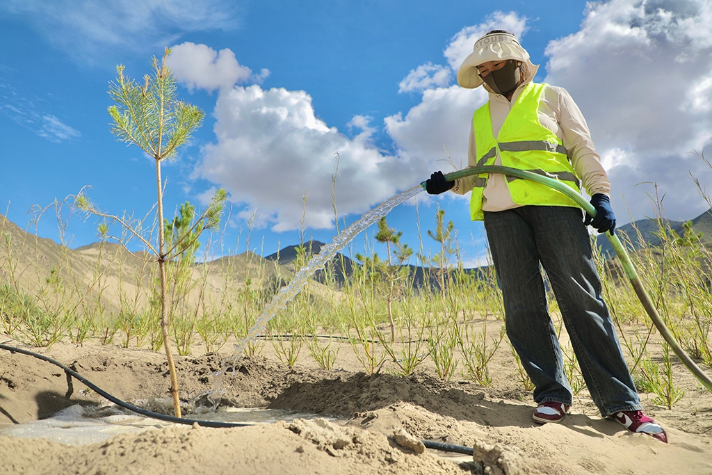 2025年7月25日,拉萨南北山绿化工程施工人员在灌溉树苗。拉萨南北山绿化工程,是西藏自治区近年来重点推进的重大生态建设工程,旨在通过大规模植树造林,彻底改善拉萨周边的生态面貌,增强水源涵养与防风固沙能力。建设者们已成功种下2.8万亩树林,点点绿色勾勒出西藏的生态画卷。人民网记者 次仁罗布摄