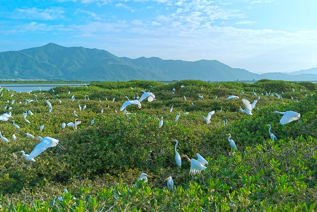 2025年7月4日,成群鹭鸟在红树林上停歇。作为福建首个国际重要湿地,漳江口红树林国家级自然保护区总面积2360公顷,是我国北回归线北侧种类最多、生长最好的红树林天然群落。根据最新的鸟类监测记录,该保护区共记录有鸟类160种,其中,被列入国家重点保护名录的鸟类20多种,常年分布和迁徙停歇的鸟类数量达到2万余只,已然成为名副其实的“鸟类天堂”。人民网 李昌乾摄