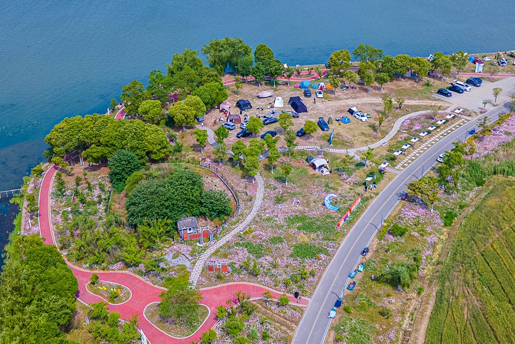 2025年5月4日,江苏省昆山市,游客在明镜荡国家水利风景区休闲游玩。明镜荡国家水利风景区位于江苏省昆山市锦溪镇,总面积32平方公里,其中水域面积10.78平方公里,是昆山市首个国家级水利风景区。景区经过疏浚治理、筑堤固河,形成了水体资源丰沛、河湖贯通、调蓄滞洪功能完备的水系,布设了“一心一廊五区”景观布局,将水利建设与打造美丽乡村相结合,融水利科普、休闲度假和园林景观为一体,打造出了人水和谐的水利样板景区。人民网记者 王初摄