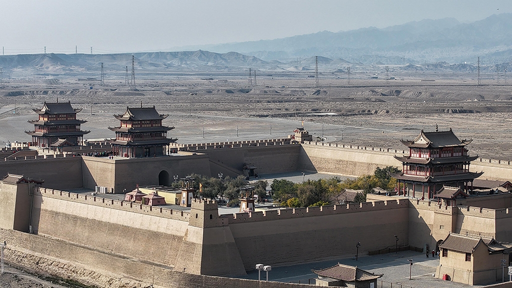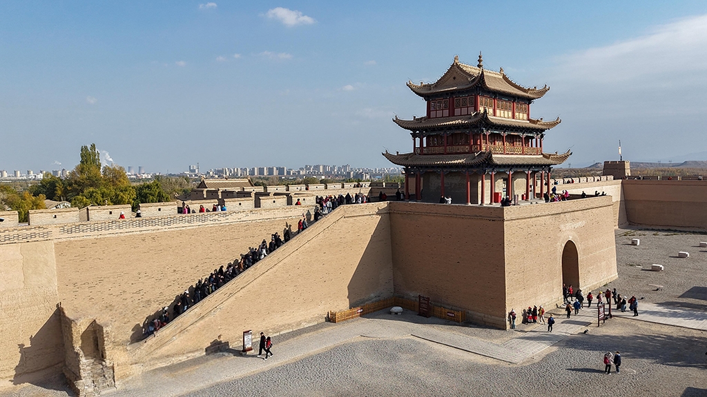 2025年10月16日,甘肃省嘉峪关市关城景区,游客登上城楼领略大漠雄关的壮阔美景。陈坤摄(人民图片网)