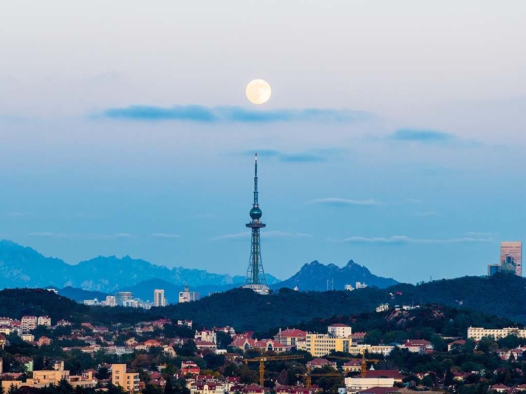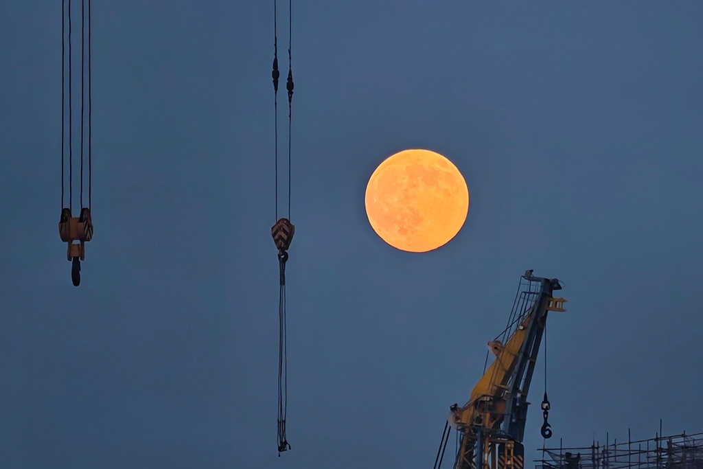 2025年11月5日傍晚,山东青岛上空出现“超级月亮”,皓月当空,美不胜收。杨雪梅摄(人民图片网)