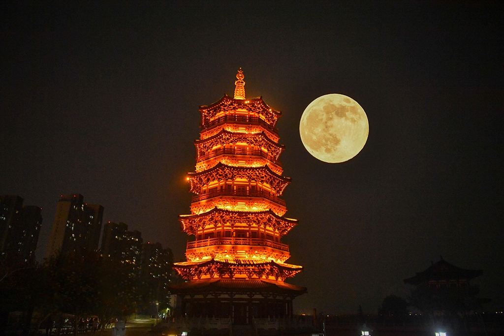 2025年11月5日,“超级月亮”与河南省洛阳市瀍河区朱樱塔相映成景(二次曝光)。李卫超摄(人民图片网)
