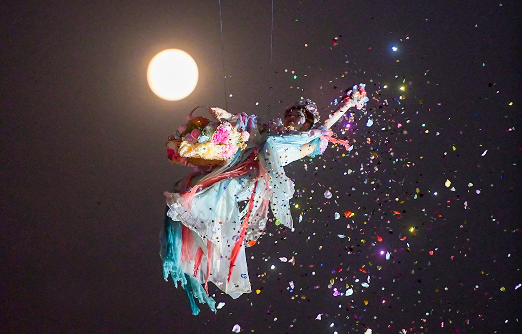 2025年11月5日,在河南省洛阳市洛邑古城景区,演员表演的“仙女散花”与“超级月亮”构成一幅美丽的画卷。张怡熙摄(人民图片网)