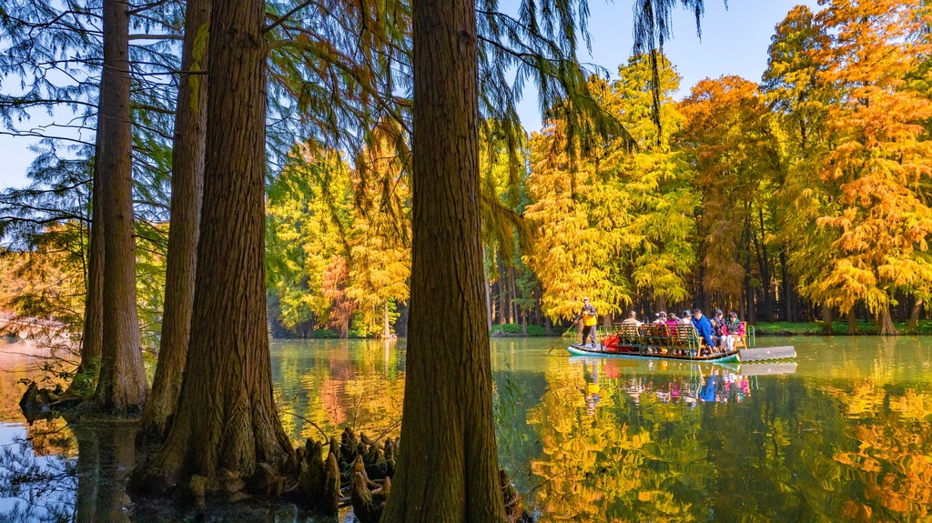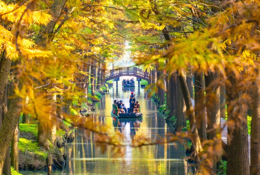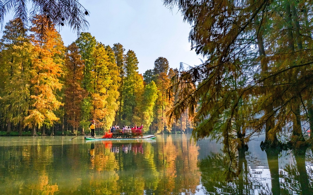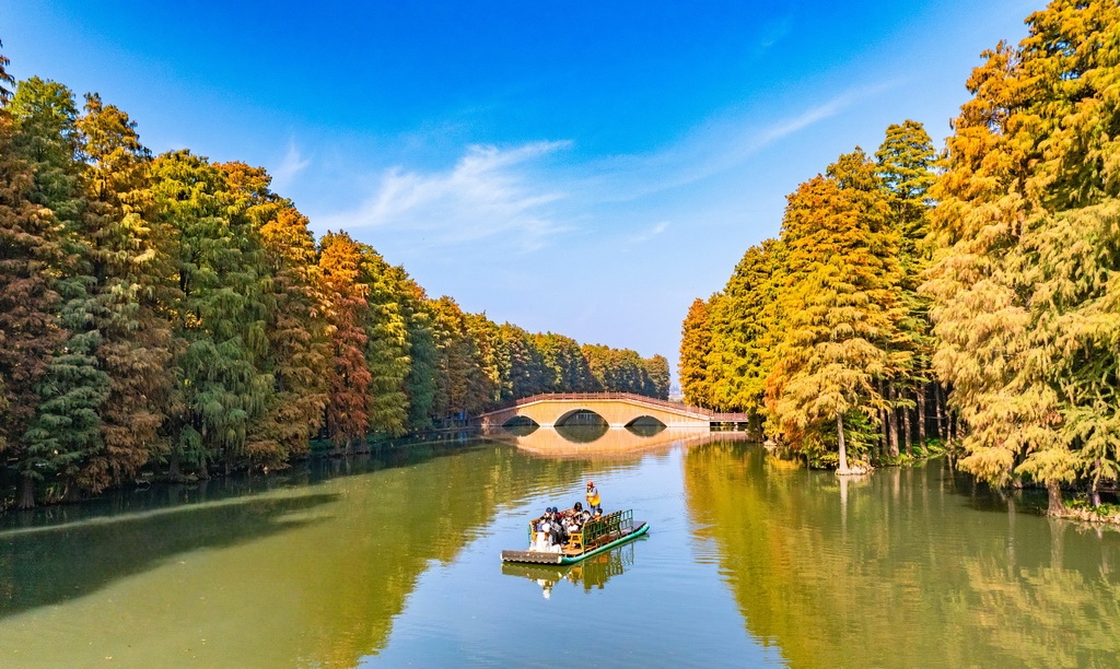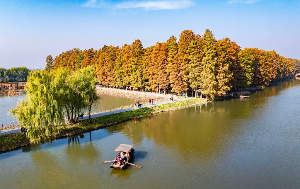 初冬时节,江苏兴化里下河国家湿地公园层林尽染、色彩斑斓,如画美景吸引不少游客前来游玩。周社根摄(人民图片网)
