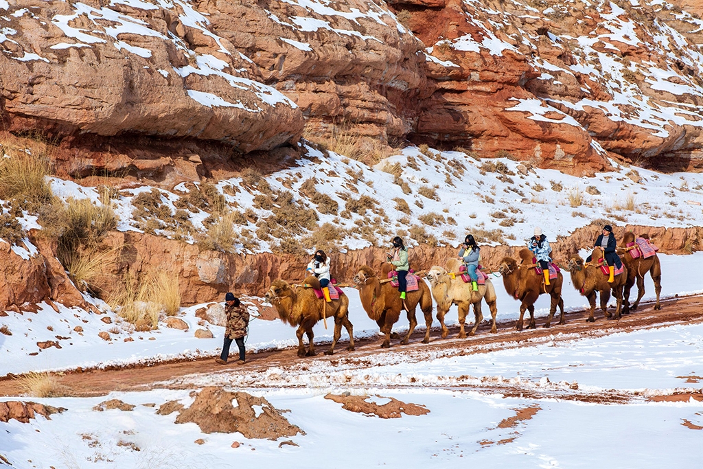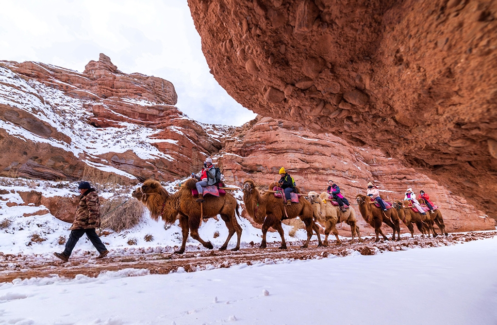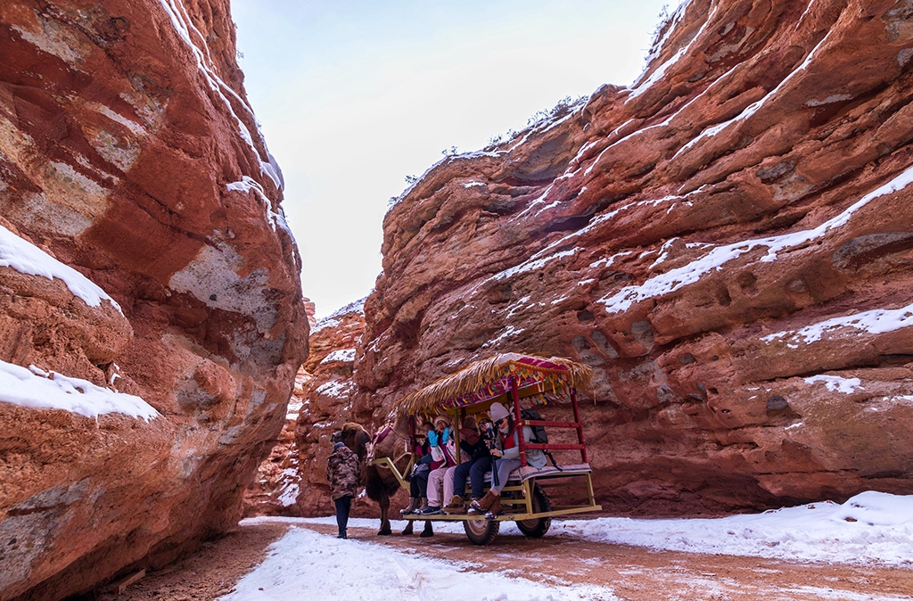 2025年12月14日,甘肃省张掖平山湖大峡谷景区,游客穿行于峡谷之中,沉浸式感受亿万年地质遗迹的苍茫壮阔,邂逅时光雕琢的自然奇观。杨潇摄(人民图片网)