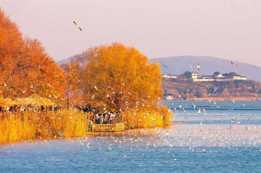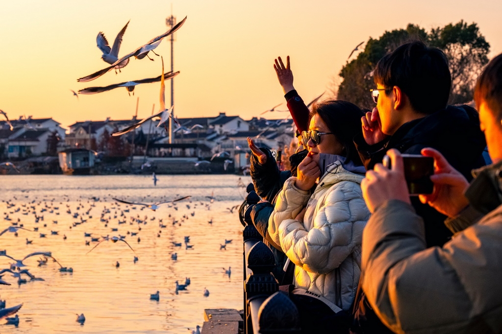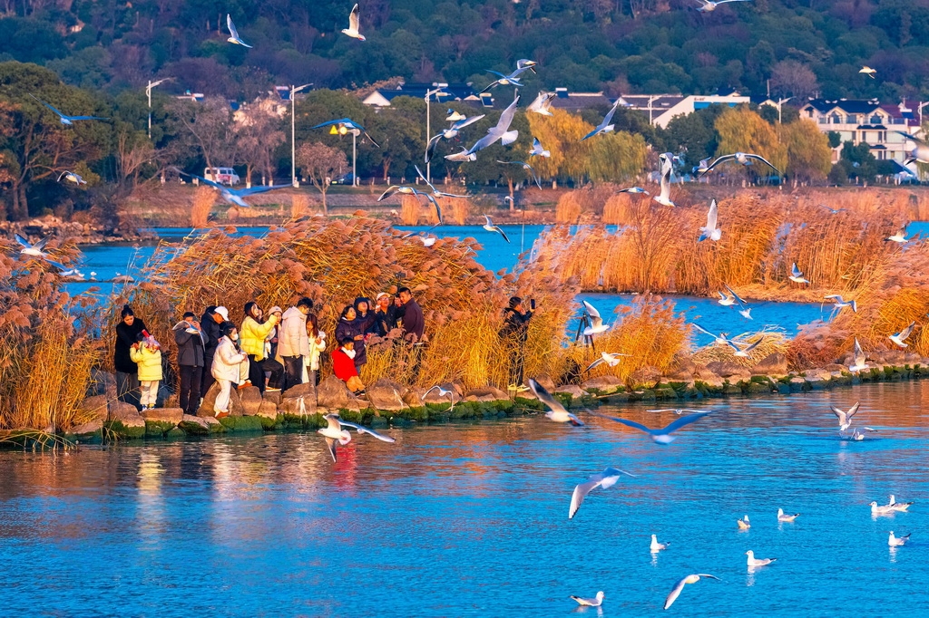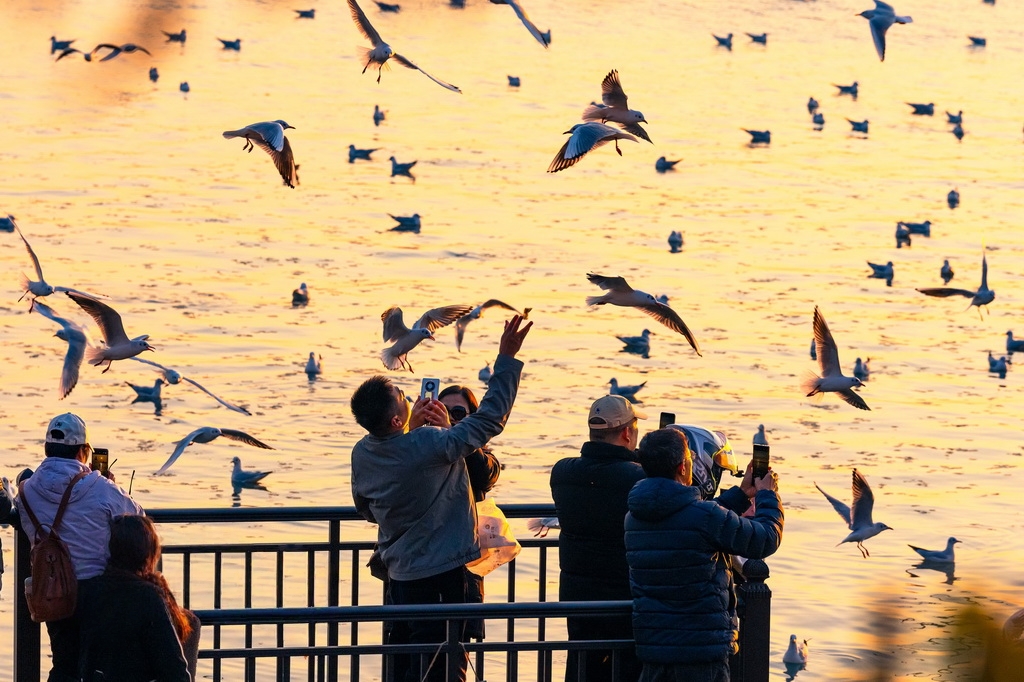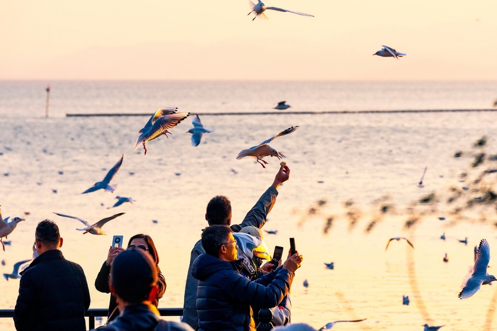 2025年12月25日,江苏省苏州市吴中区,大批红嘴鸥在太湖渔港村越冬觅食,引来众多游客观赏拍照,人鸥互动其乐融融。张锋摄(人民图片网)