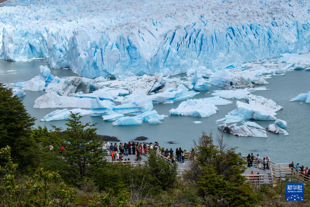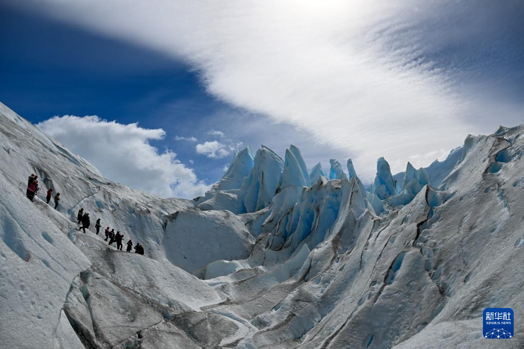 1月3日,游客在阿根廷圣克鲁斯省冰川国家公园内的莫雷诺冰川上行走【5】。