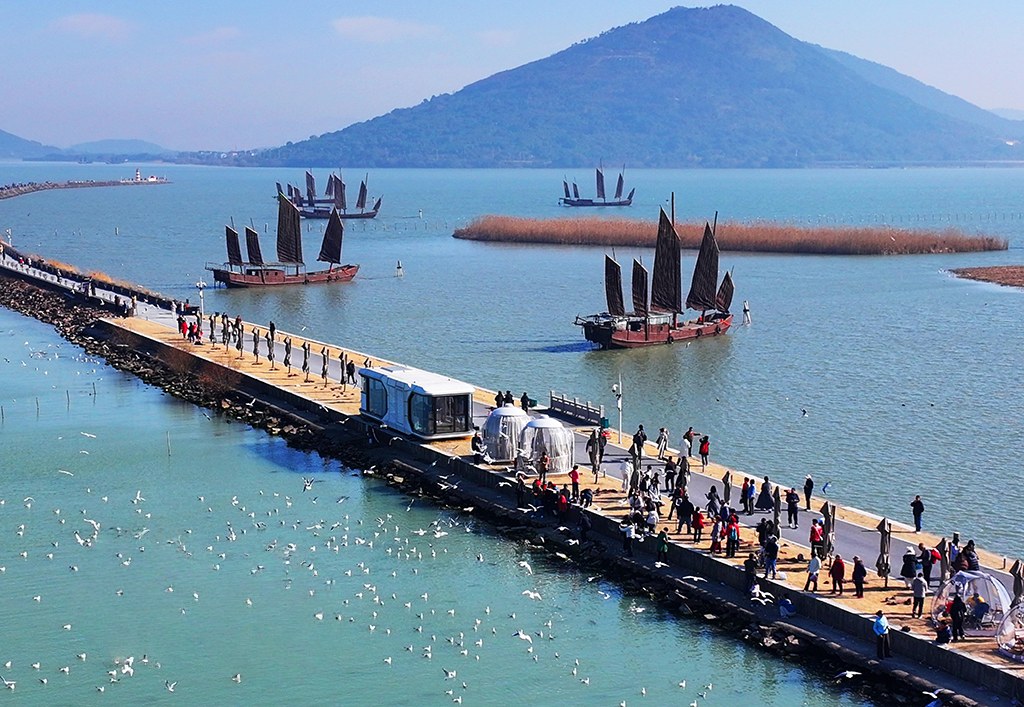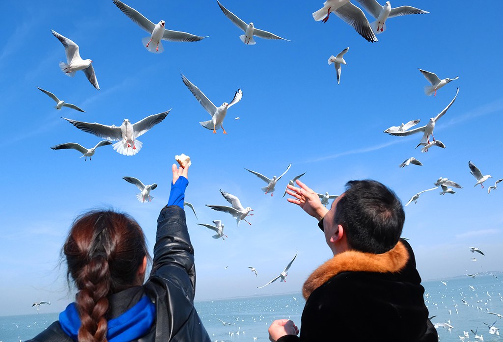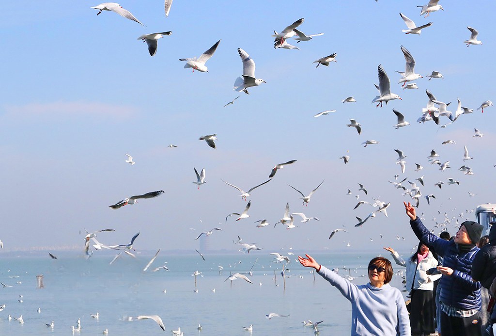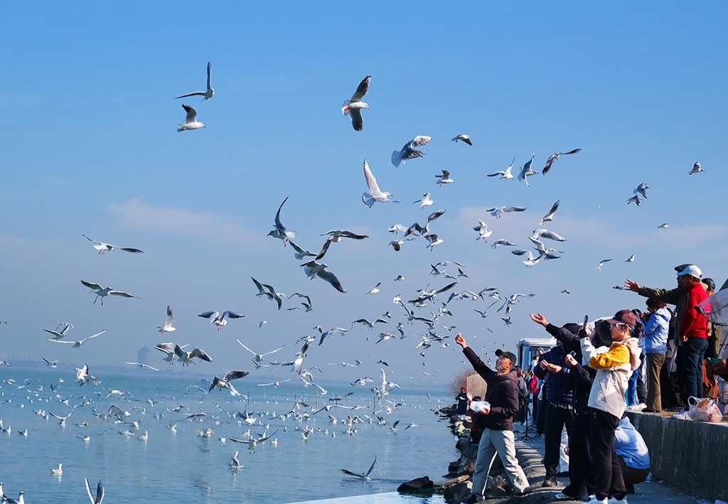 2026年1月14日,冬日暖阳中,大批红嘴鸥在江苏苏州吴中区光福镇太湖水域越冬觅食,翩跹飞舞,吸引众多游客前来赏鸥观景,人鸥相谐,构成一幅灵动的冬日生态图景。王建中摄(人民图片网)