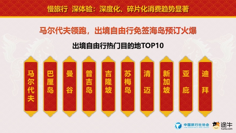 碎片化方面,自驾游、自由行、私家团、定制团、小团游等灵活、个性的打包旅游产品占比增长明显。途牛春节团期打包旅游产品预订中,周边游方向自驾游用户预订出游人次占比超85%,出境短线游方向自由行用户预订出游人次占比过半。