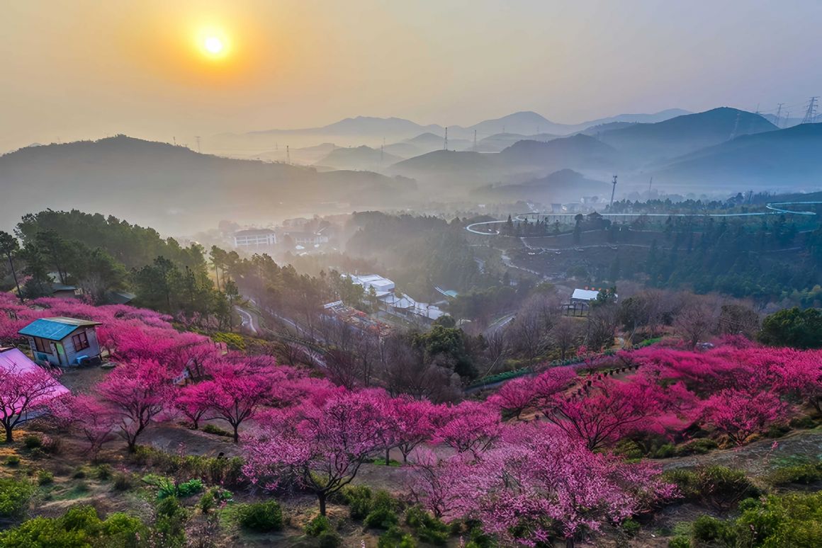 2026年2月11日,浙江长兴县和平镇城山村,漫山梅花盛开,与远山、村落相映,景致如画。方金华摄(人民图片网)