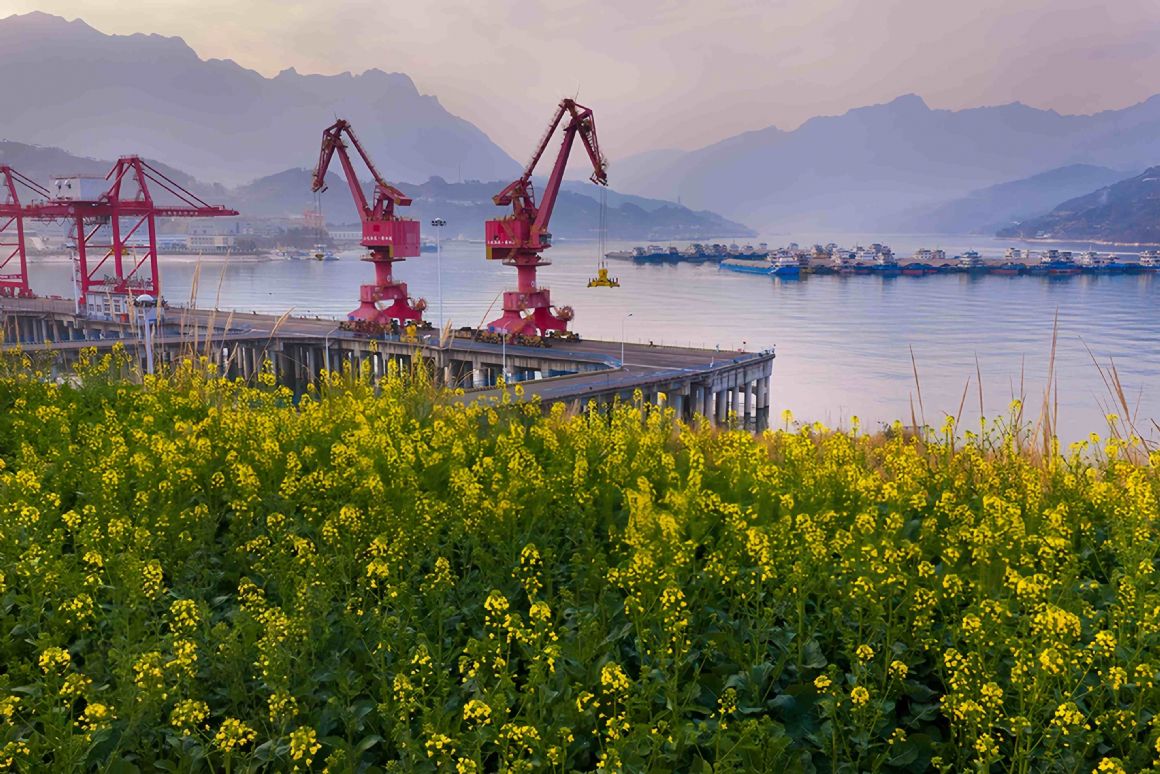 2026年2月10日,湖北宜昌秭归港集装箱码头旁,油菜花盛开。郑坤摄(人民图片网)
