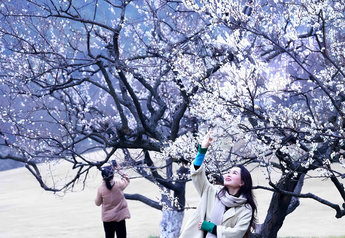 眼下,浙江杭州临平区塘栖镇超山风景区漫山遍野的梅花渐次绽放,如雪如霞,姿态万千,将景区装点得春意盎然,吸引众多游客前来踏春赏花。周方玲摄(人民图片网)