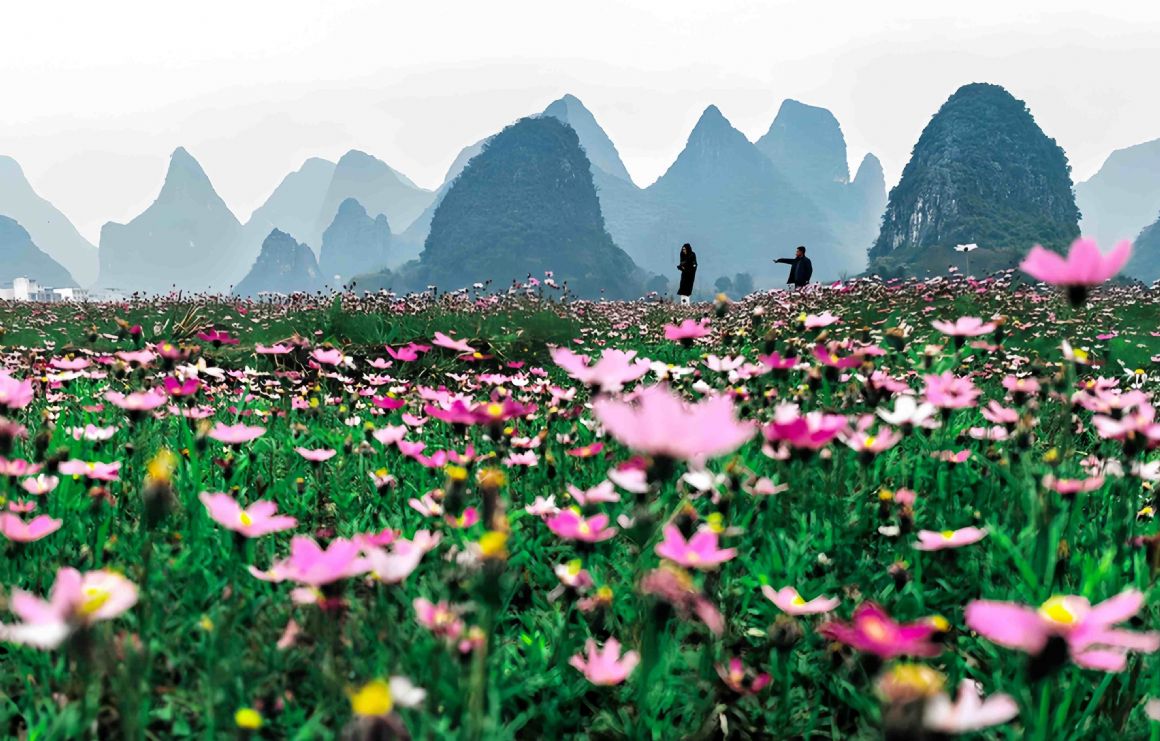 2026年2月4日,广西桂林临桂区四塘镇田心村,数百亩格桑花率先绽放,洋溢着浓郁的春意。刘教清摄(人民图片网)
