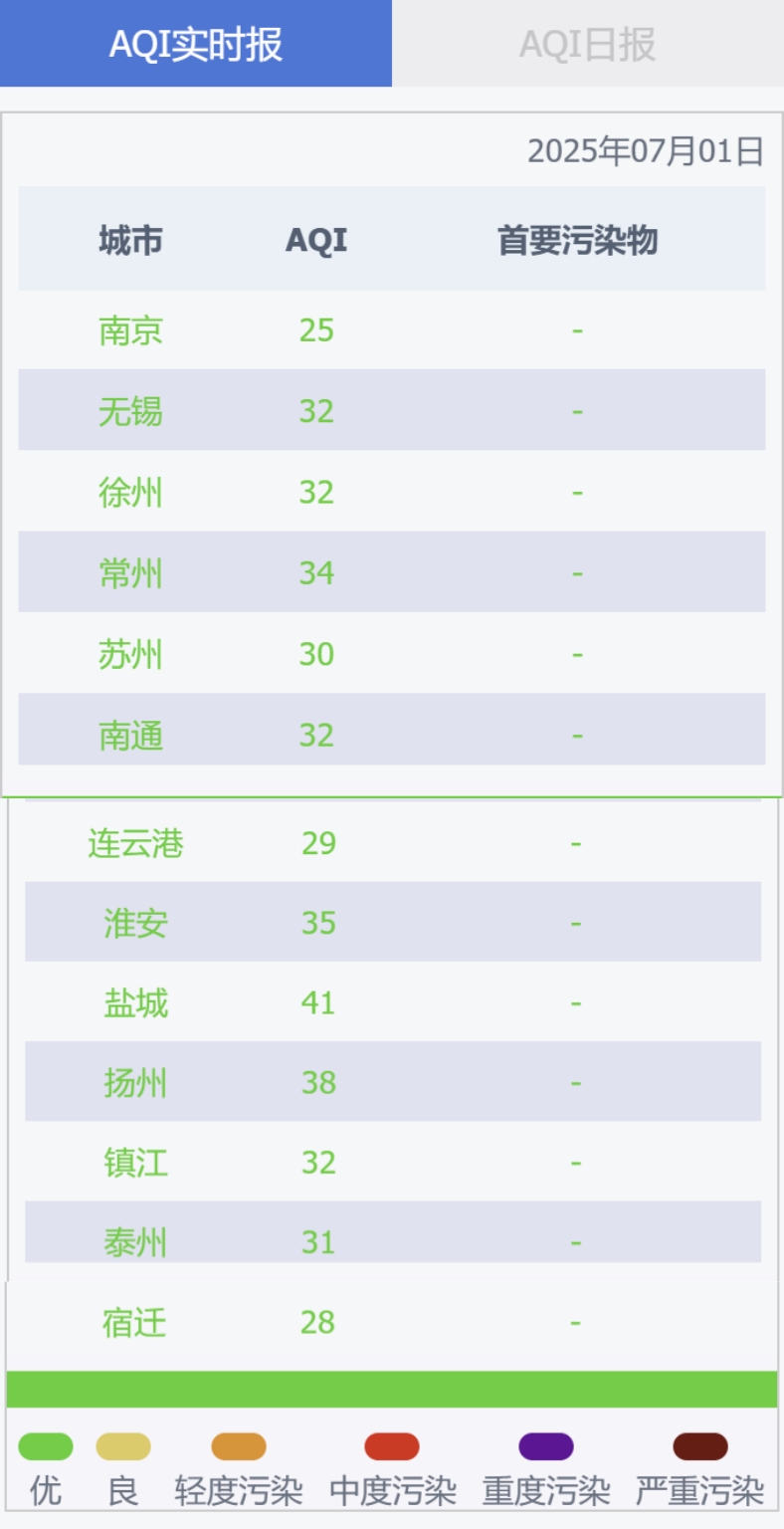 江苏省13个设区市2025年07月01日空气质量情况