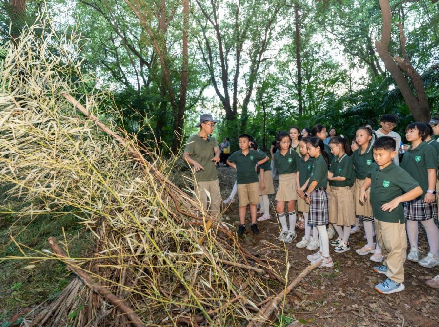 “活动的每个环节都为孩子们准备了任务卡,引导他们观察、记录身边的野生动物。”高原老师介绍道。活动全程贯穿“实践赋能”理念:在资源回收区,孩子们围绕“零废弃”主题展开生态探索,直观理解“变废为宝”的环保意义;“城市森林大探险”环节,大家分组走进城市森林,一边观察、记录沿途发现的动植物,一边用树枝、落叶搭建“本杰士堆”——为小型野生动物打造专属庇护所,孩子们在亲身实践中践行生态保护。