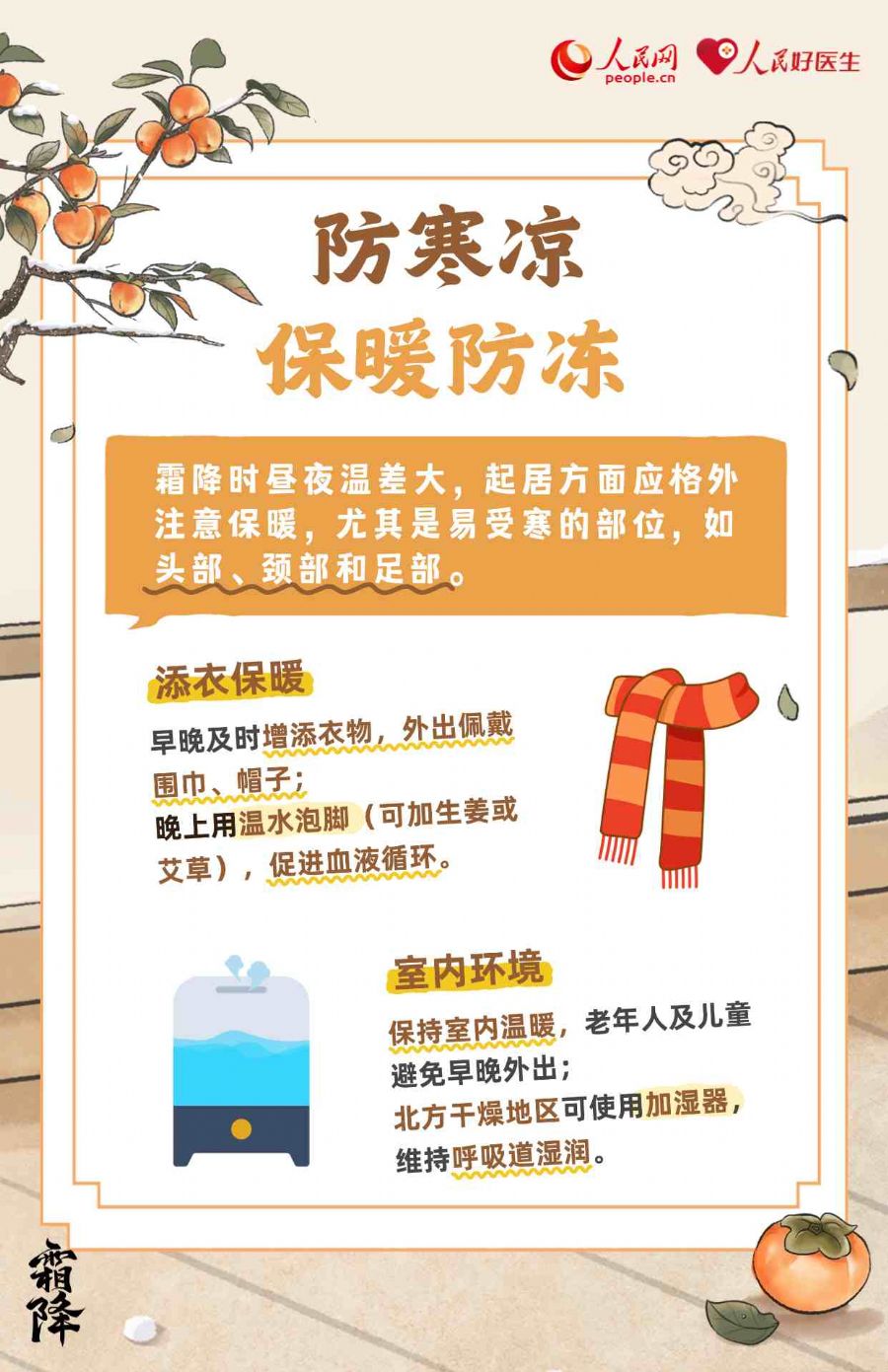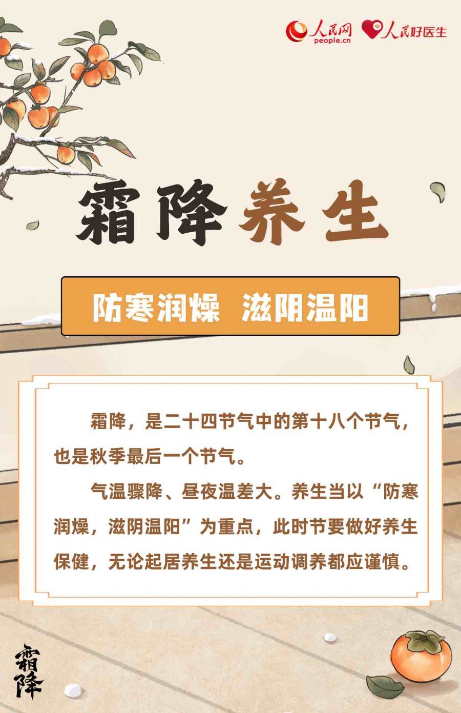 霜降,是二十四节气中的第十八个节气,也是秋季最后一个节气。气温骤降、昼夜温差大。养生当以“防寒润燥,滋阴温阳”为重点,此时节要做好养生保健,无论起居养生还是运动调养都应谨慎,湖北省中医院治未病中心主任医师杨帆为大家带来深秋养生攻略。