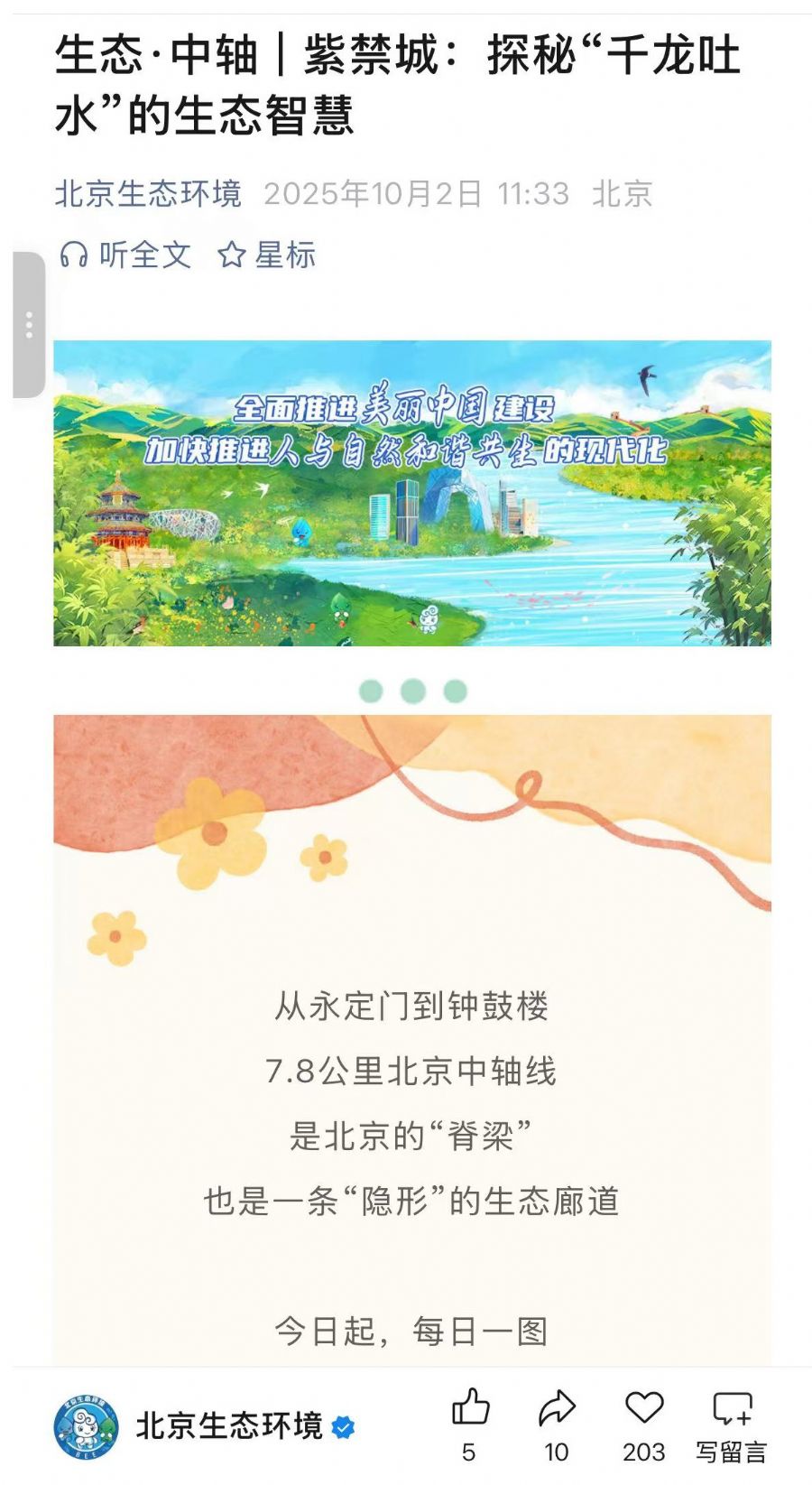 国庆中秋长假期间,“北京生态环境”围绕北京中轴线策划“生态?中轴”系列长图,以北京中轴线7.8公里地理跨度为明线,与“隐形生态廊道”相结合,串联起文化遗产保护与生态智慧。特别是以紫禁城“千龙吐水”为纽带,深入介绍了紫禁城排水系统中蕴含的古人生态智慧。“安徽生态环境”以“专属月饼”为创意载体,将环保人坚守、担当、奉献的职业精神化作独特“风味”,既传递了中秋节日祝福,更展示了“生态环保铁军”的形象。“陕西生态环境”以“陪伴式科普”为核心,创新推出“国庆环保七日小课堂”系列内容,通过每日聚焦一个生活场景进行科普,引导公众将绿色理念融入日常。