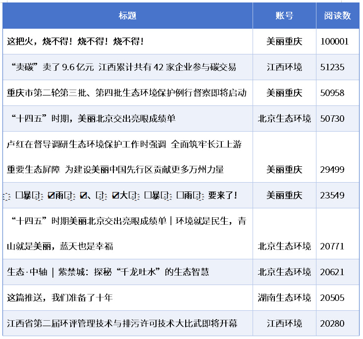 江西、重庆、北京等账号的多篇推文广受关注,内容聚焦各地生态环保工作动态与成果。包括“江西环境”《“卖碳”卖了9.6亿元 江西累计共有42家企业参与碳交易》《江西省第二届环评管理技术与排污许可技术大比武即将开幕》、“美丽重庆”《重庆市第二轮第三批、第四批生态环境保护例行督察即将启动》《卢红在督导调研生态环境保护工作时强调 全面筑牢长江上游重要生态屏障 为建设美丽中国先行区贡献更多万州力量》,以及“北京生态环境”《“十四五” 时期,美丽北京交出亮眼成绩单》《环境就是民生,青山就是美丽,蓝天也是幸福》。
