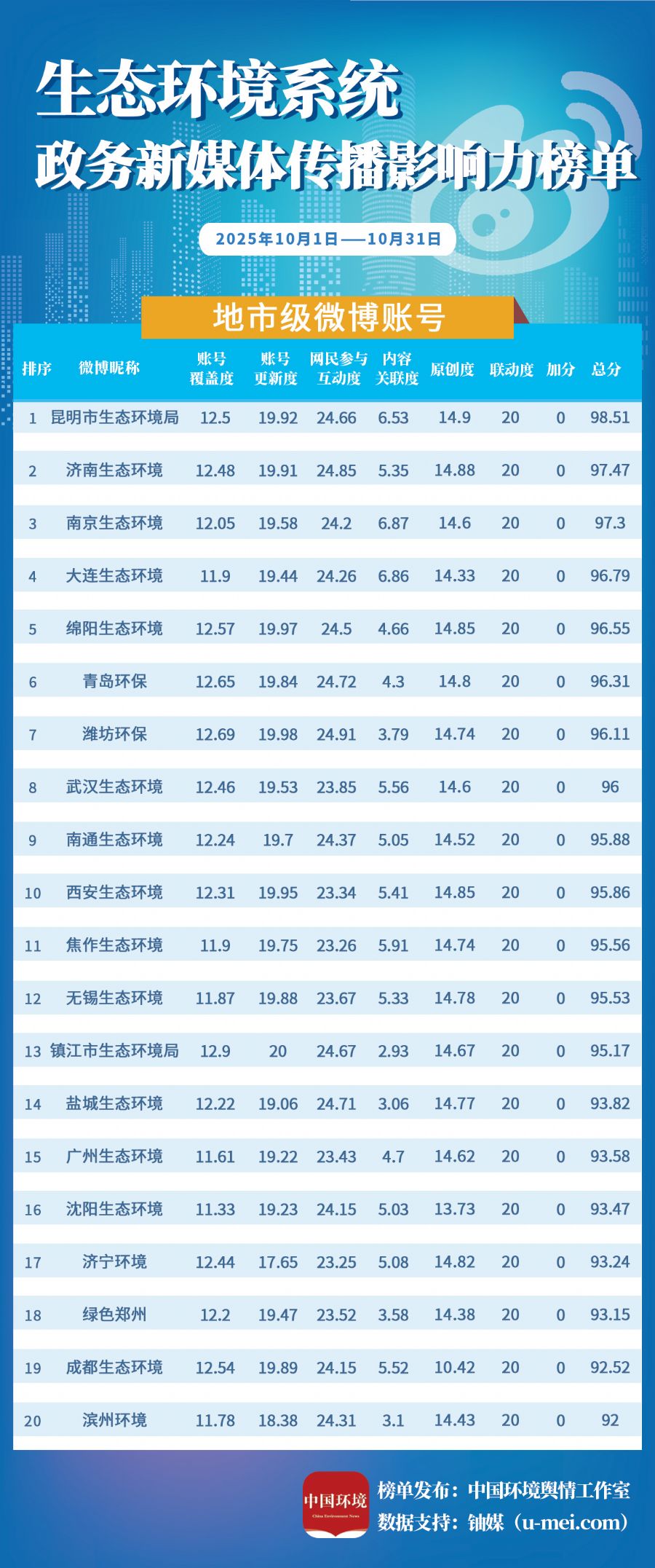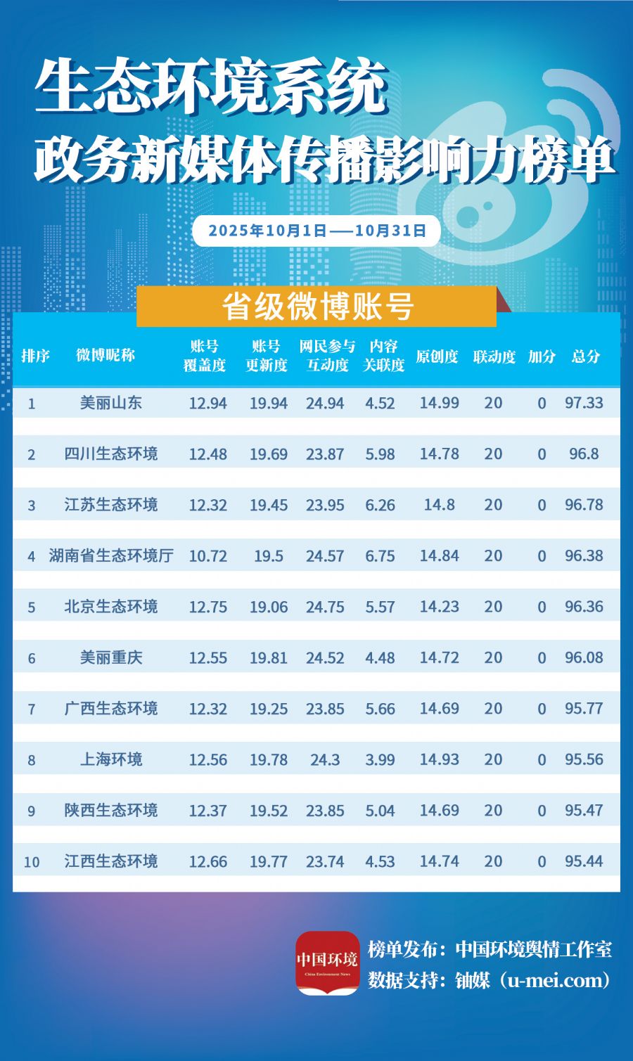 为进一步推动生态环境系统政务新媒体持续健康发展,更好发挥信息公开、舆论引导、社会治理、凝聚共识等作用,中国环境报社、中国环境客户端日前发布10月全国生态环境系统政务新媒体传播影响力榜单。