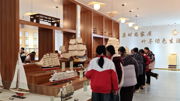 研学首站,宣讲团成员带领五里牌镇中心小学师生走进省级绿色园区双牌县竹木产业科技园,零距离感受“以竹代塑”产业发展。学生有序穿梭于展厅与车间之间,亲眼见证了一根根原生翠竹如何经过现代工艺,蜕变为环保餐具、全竹家具等40余类创新产品。“这些精致帆船,真的卖到了国外吗?”当听到工作人员介绍工艺品远销全球30多个国家和地区时,孩子们眼中充满了惊喜与自豪。这场沉浸式的参观,不仅展示了双牌将本土竹木资源转化为绿色产业的完整链条,更让一场生态文明教育在行走的课堂中落地生根,生态保护与经济发展的“双赢实践”变得可知可感。