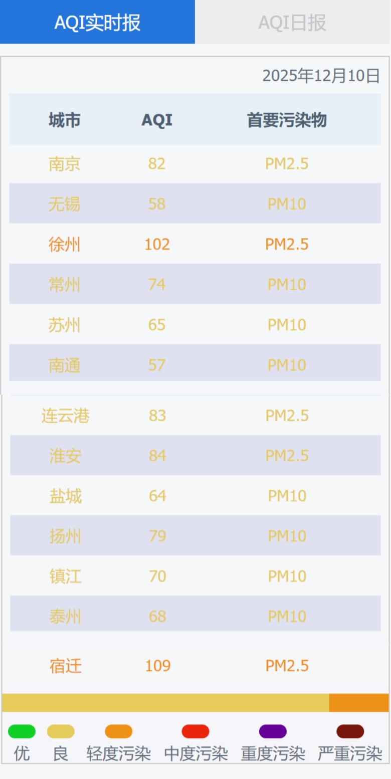 江苏省13个设区市2025年12月10日空气质量情况