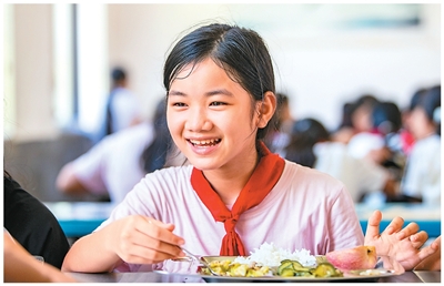 2025年9月2日,贵州省黔东南苗族侗族自治州从江县刚边壮族乡中心小学的学生在享用免费营养餐。罗京来摄(人民视觉)