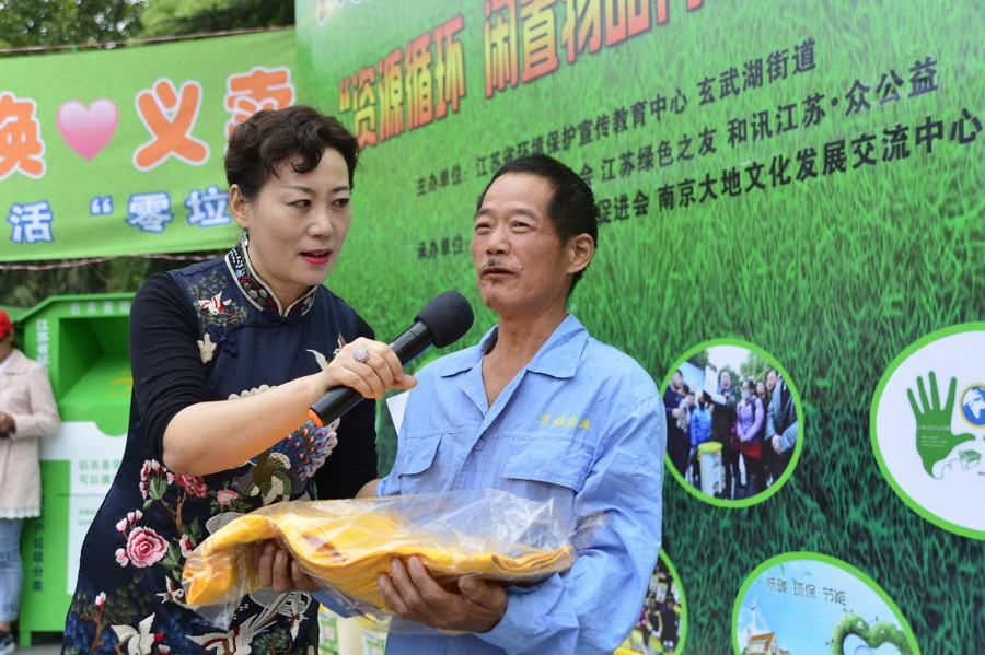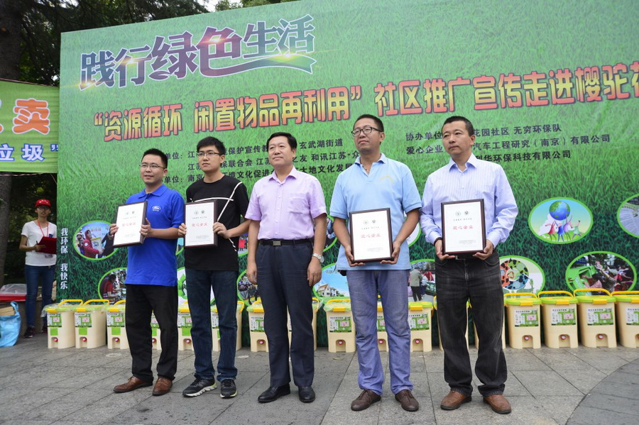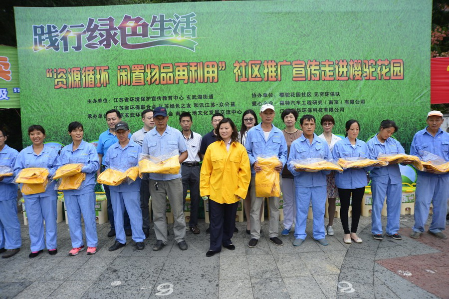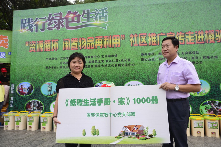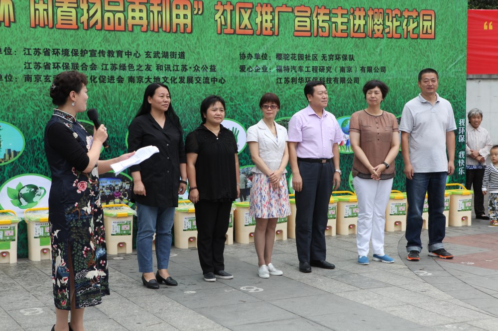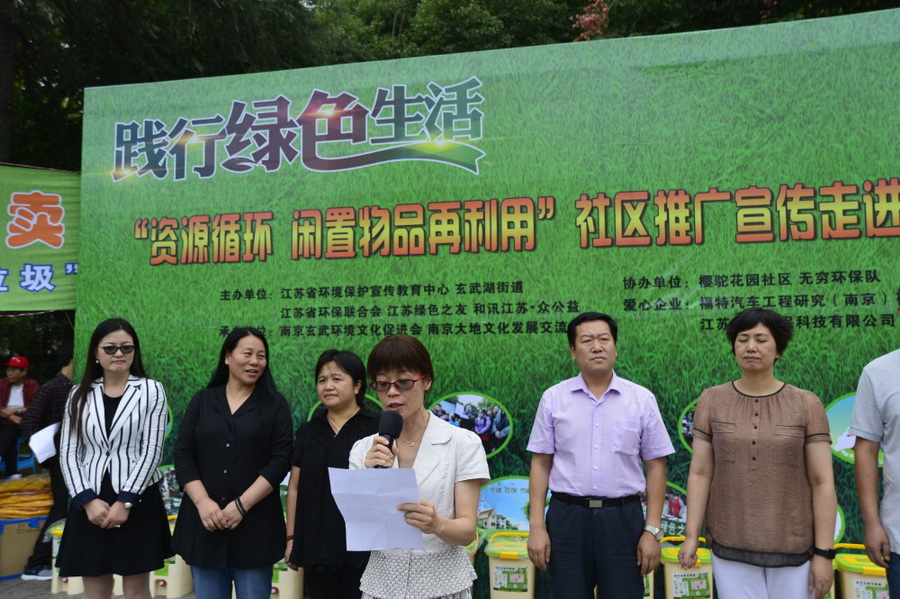 江苏环境网9月22日讯 昨天下午,由江苏省环境保护宣传教育中心、江苏省环保联合会、江苏绿色之友、南京市玄武湖街道等部门联合举办的践行绿色生活——“资源循环 闲置物品再利用”推广宣传活动走进樱驼花园社区。江苏省环境保护宣传教育中心副主任、党支部副书记赵继平、江苏省少工委副主任徐美华、南京玄武区玄武湖街道工委副书记王丽、南京玄武区玄武湖街道城管主任张浩、南京玄武区玄武湖街道民政主任余挺婷、南京樱驼花园社区主任于燕、江苏绿色之友秘书长王丽娜以及社区居民、示范家庭成员、企业代表、志愿者、环保专家、有关单位领导和媒体记者等800余人参加了活动。