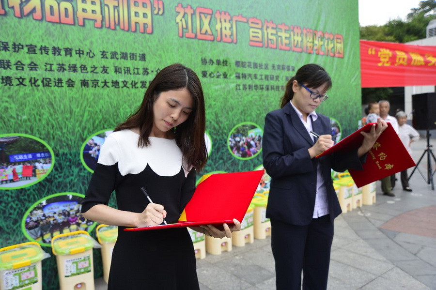 主办方代表夏丹与樱驼花园社区居委会于燕主任签订“资源循环 闲置物品再利用”社区推广宣传活动合作协议书
