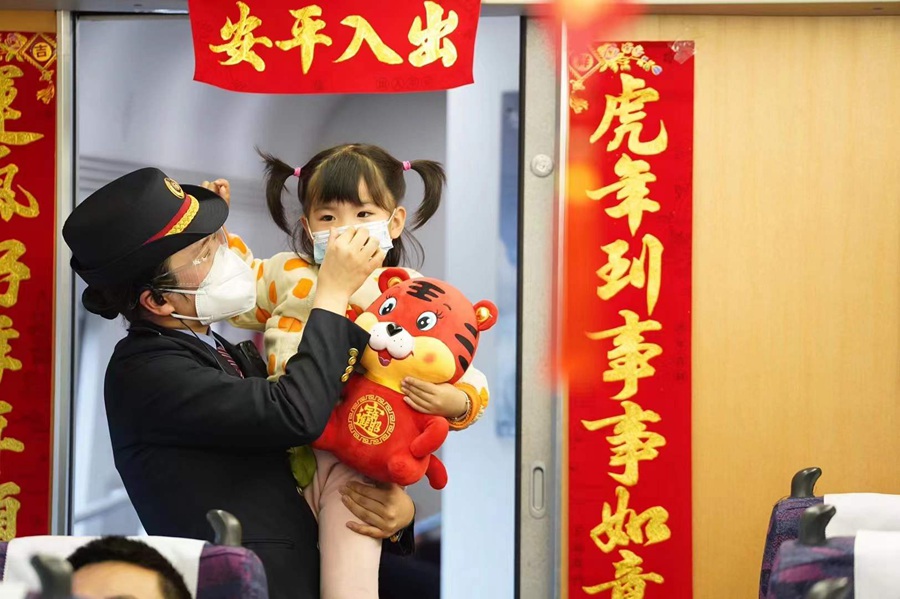 D6506次列车上,乘务员帮小女孩戴好口罩。张海根摄