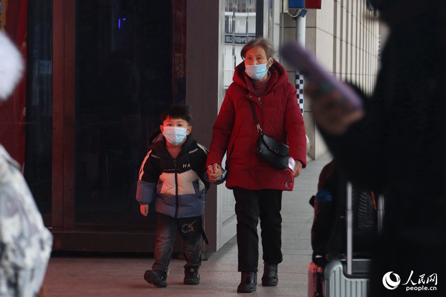 福州站中,萌娃和奶奶牵手返乡。人民网 林盈摄