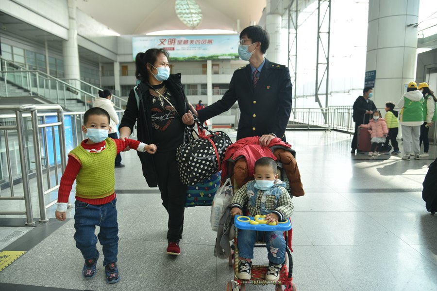 福州站中,两个小男孩在乘务员的指引下踏上归乡之路。江曲摄