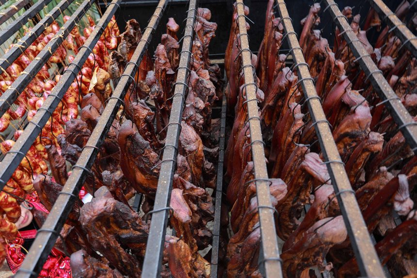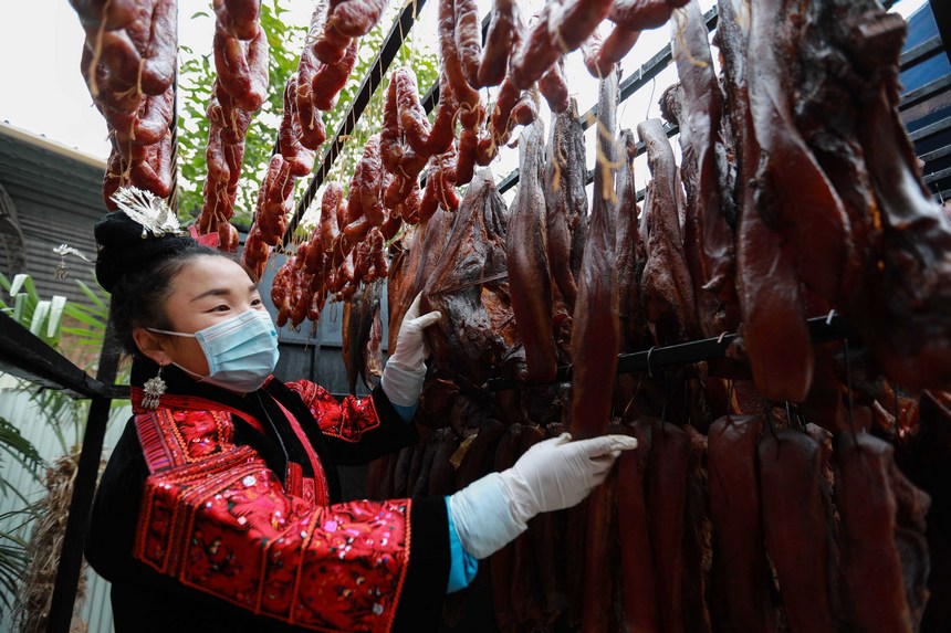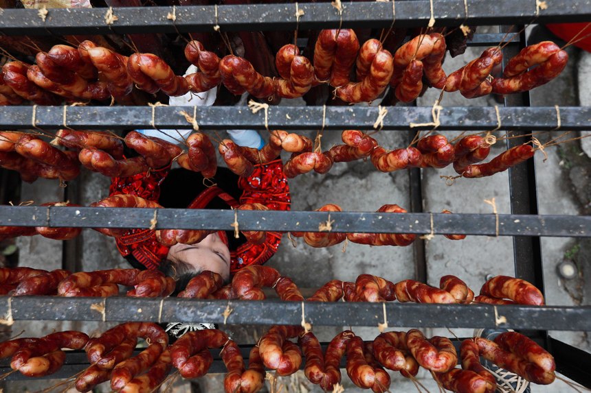 春节临近,在贵州省黔东南苗族侗族自治州剑河县岑松镇温泉村,苗族同胞正忙着腌制烘烤腊肉、香肠、板鸭,线上线下为顾客提供风味浓郁的腊味年货,供应市场。(图/文 万文杰、杨家孟、吴昌连)