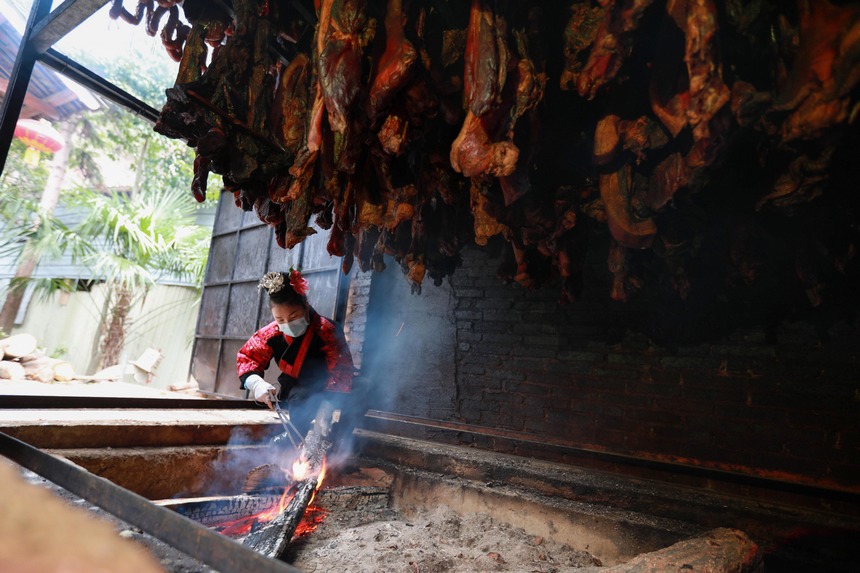 2023年1月2日,苗族群众在烘烤腊肉、香肠。