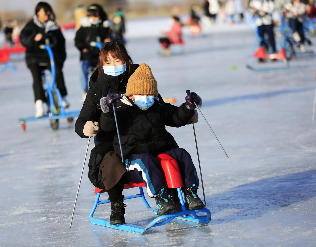 1月1日,市民在甘肃张掖国家湿地公园滑冰场坐滑冰车。 新华社发(陈礼摄)