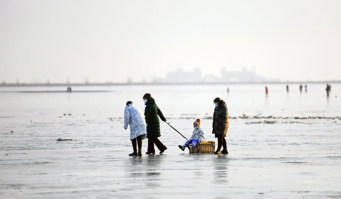 1月2日,游客河北唐山海港经济开发区海滩的冰面上游玩。 新华社发(刘满仓摄)