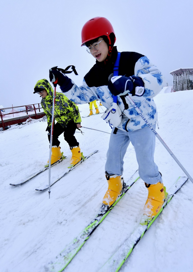 1月2日,游人在湖北省宣恩县一滑雪场体验滑雪。 新华社发(陈绪开摄)