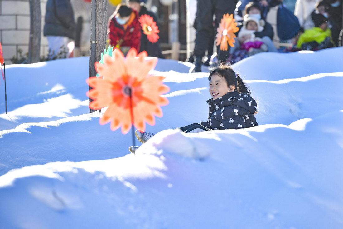 1月2日,在天津市蓟州区一主题乐园,小朋友体验“高山雪圈”项目。新华社发(王金一摄)