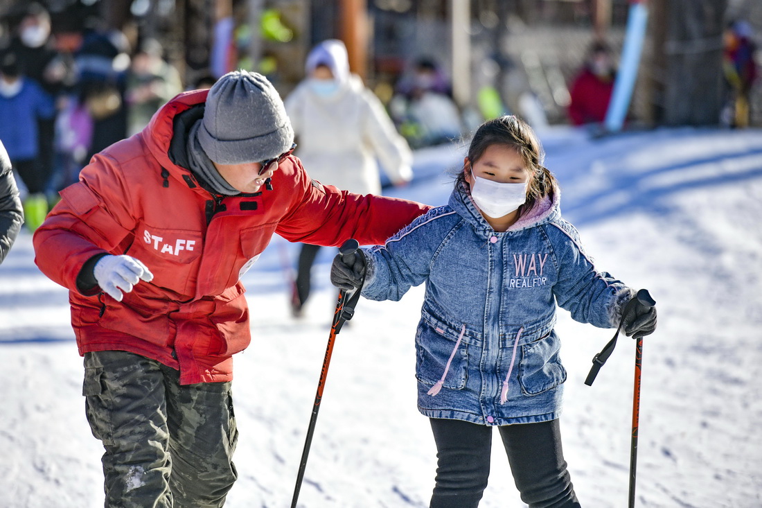 1月2日,在天津市蓟州区一主题乐园,小朋友在教练的陪同下体验初级滑雪。 新华社发(王金一摄)